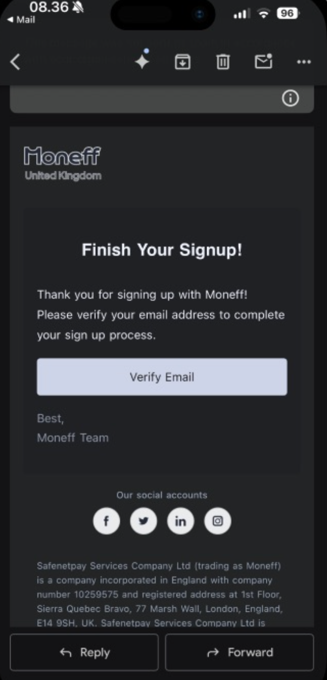 - Elektron pochtangizni (Email) tekshirib Moneff’dan kelgan habarni topib, ichidagi ‘Verify Email’ga bosib, emailingizni tasdiqlang.
