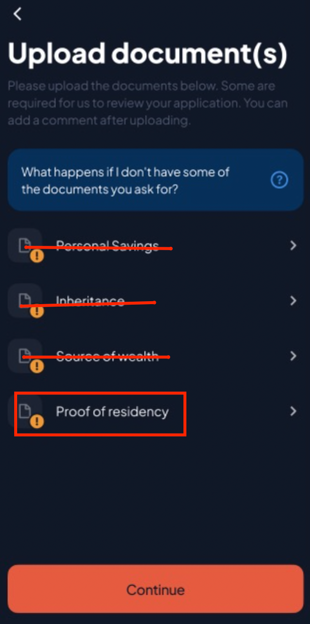 - Upload documents - hujjat yuklang. Bu yerda sizdan Proof of residency - ya’ni manzilingizni taasdiqlaydigan hujjat talab qilinadi. Arizaning 8chi qadamida bergan manzilingizni tasdiqlaydigan hujjat kerak bo’ladi. Agar Germaniyaga 3 oy ichida kelgan bo’lsangiz Meldebestaetigung degan hujjatni yuklasangiz bo’ladi. Boshqa qabul qilinadigan hujjatlar: boshqa bank (Sparkasse, Volksbank…) hisob raqamidan ko’chirma (Kontoauszug), yoki ijara shartnomas (Mietvertrag)i.